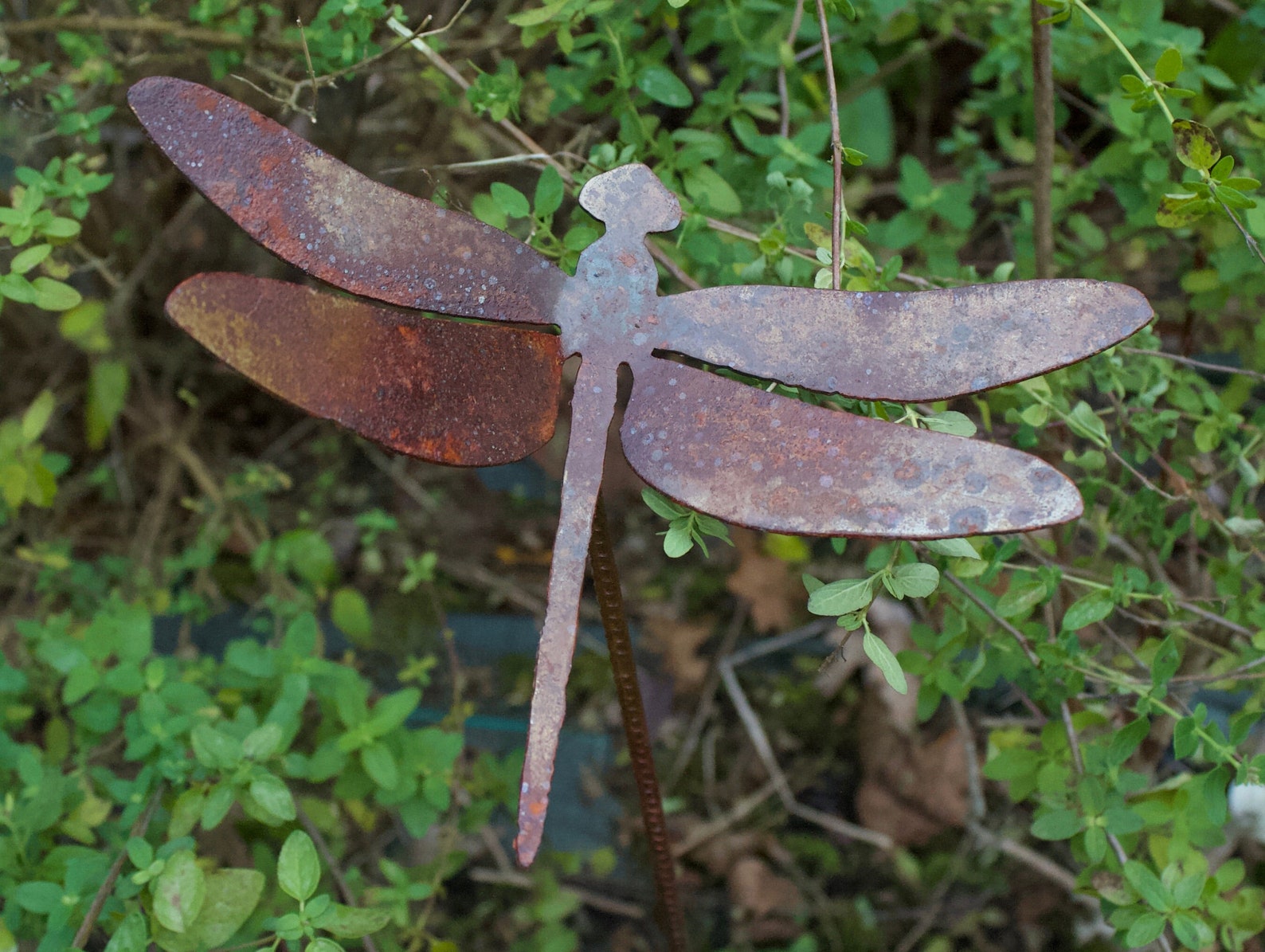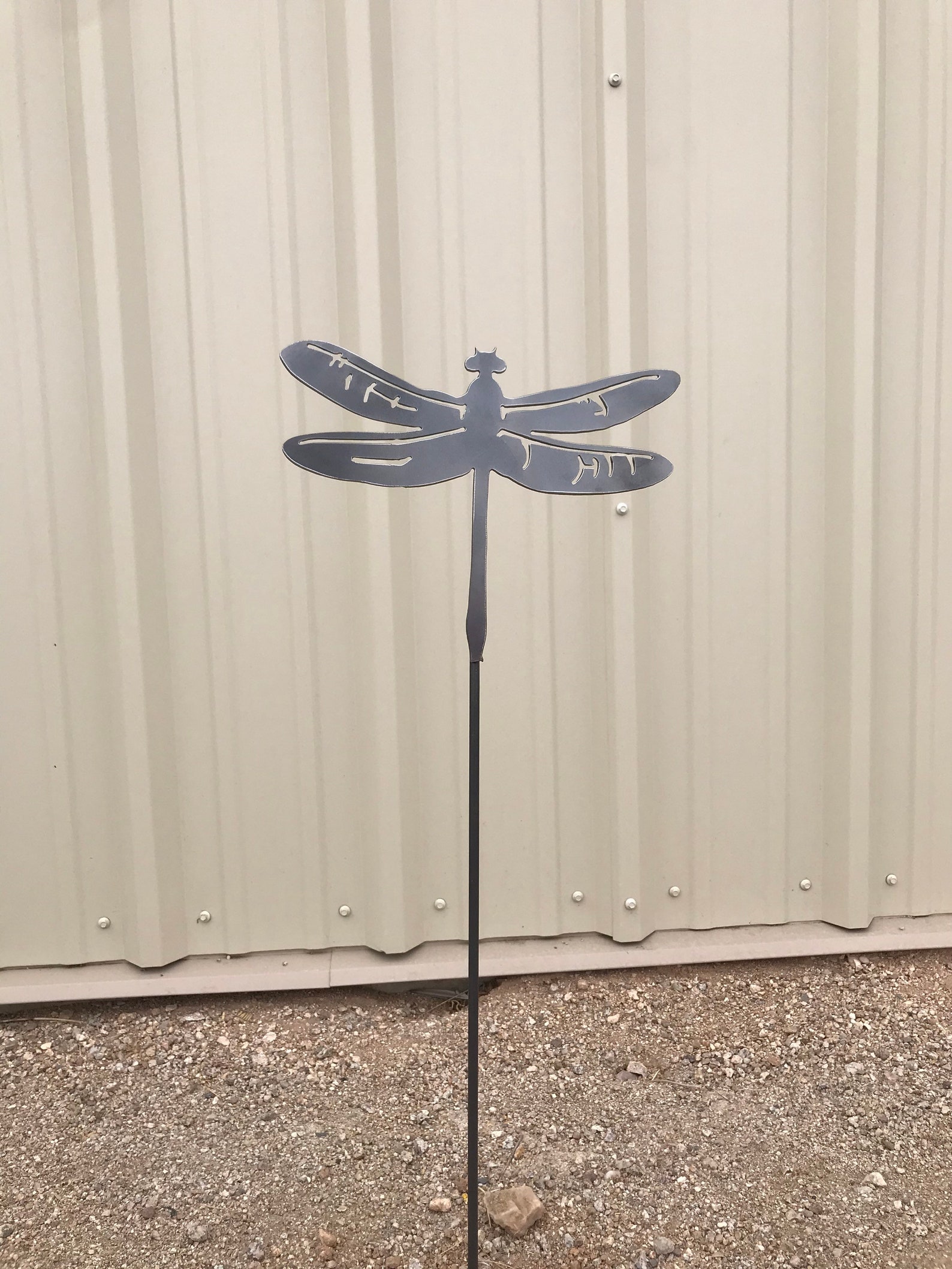 Dragonfly Garden Stake this dragonfly garden stake is made from mild steel which has developed a unique rust patina. check out our dragonfly garden stake selection for the very best in unique or custom, handmade pieces from our garden. This dragonfly stake is 250mm wide x 650mm high. Order now from overwrought garden art. check out our dragonfly garden stakes. Dragonfly Garden Stake.